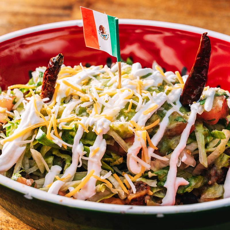 Chicken, Chili, Steak, Cheese | Homemade tortilla chips, melted mixed jack & cheddar cheese, topped with lettuce, guacamole, sour cream, pico de gallo, olives, jalapenos.